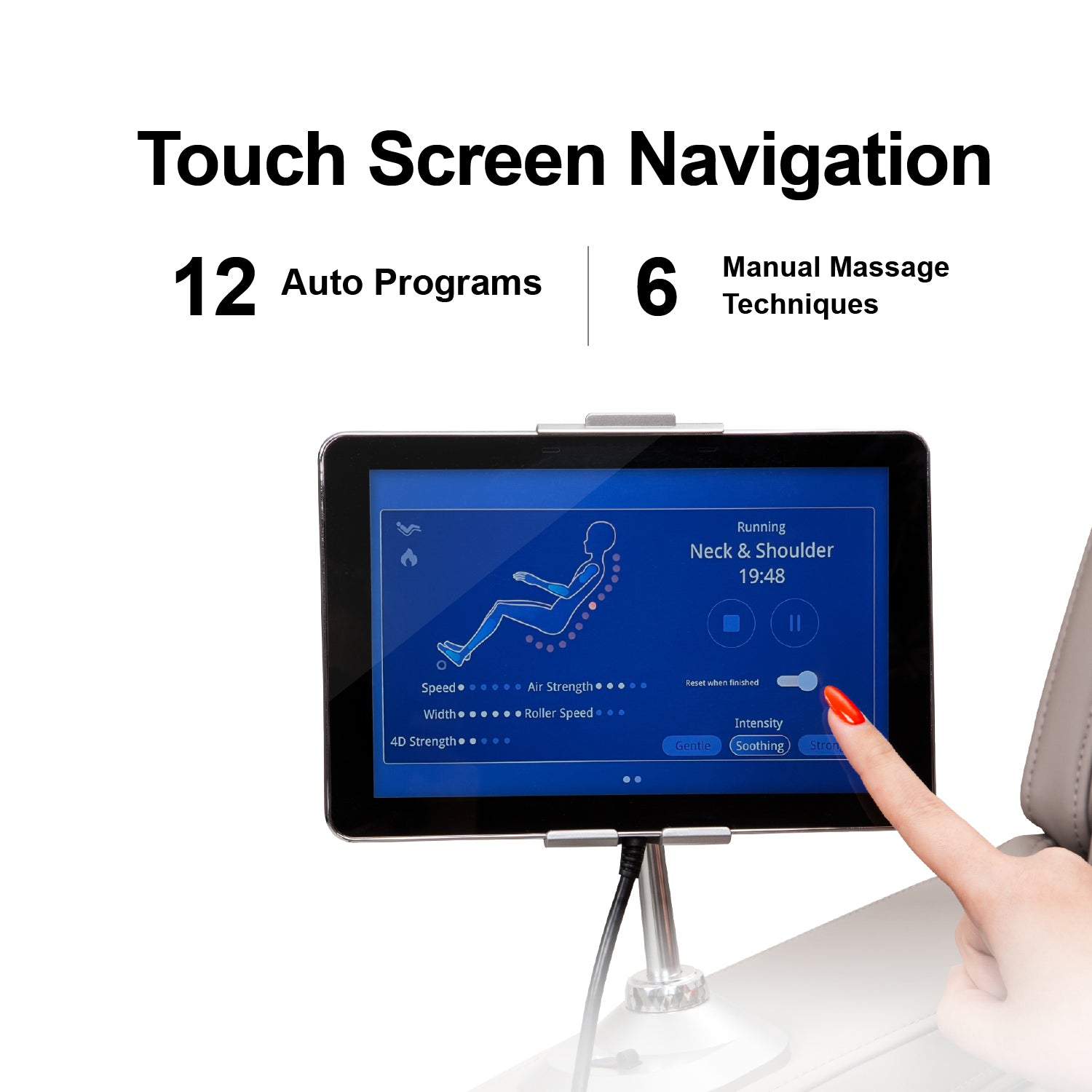 Ultima’s includes a touchscreen controller for easy navigation and adjustment settings. The massage chair provides 12 auto massage modes and 6 manual massage styles.