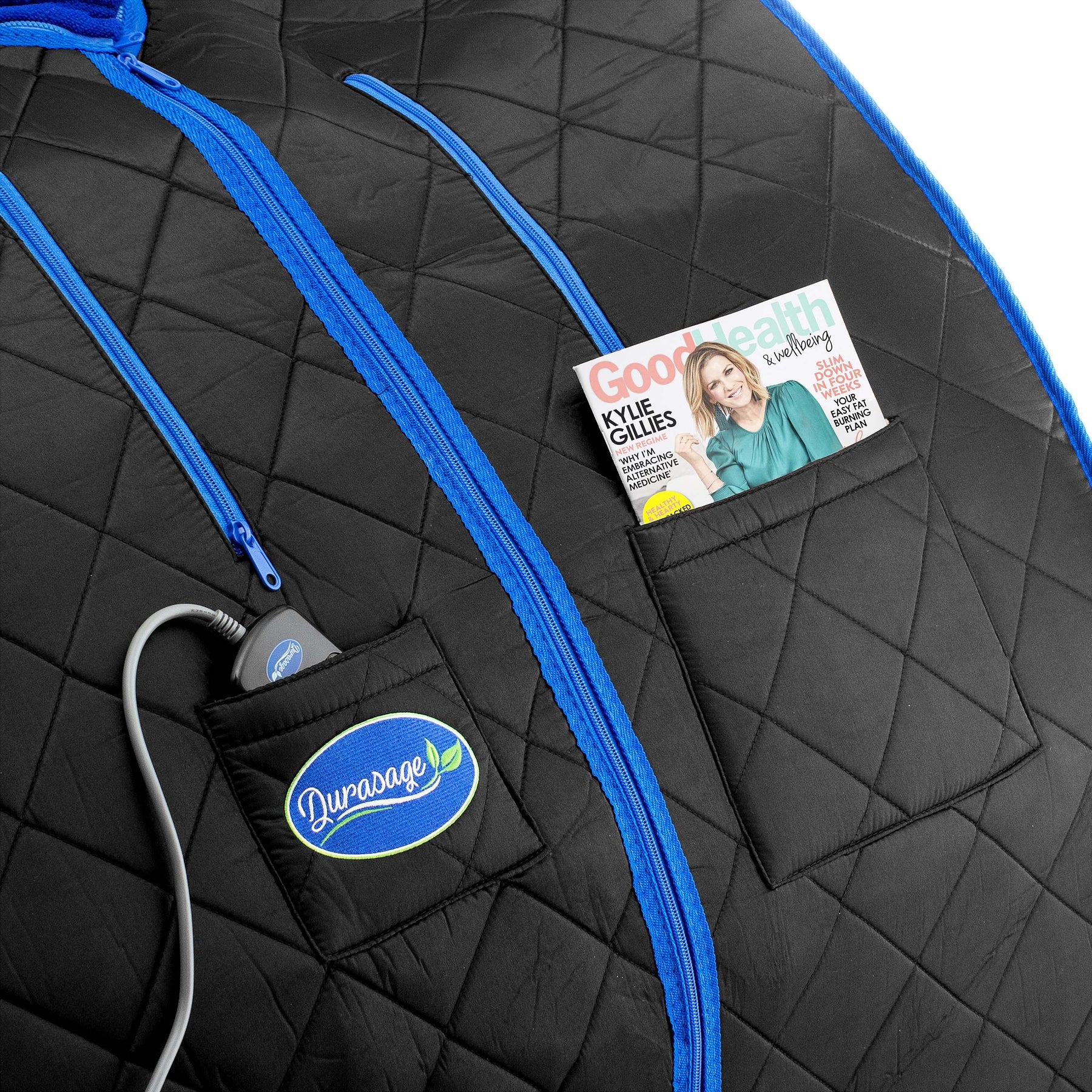 - CHAIR INCLUDED: A foldable sports chair is included with the sauna. It also comes with a washable neck collar, sewn-in pockets for books or devices, a relaxing foot pad, and a convenient, hand-held control.