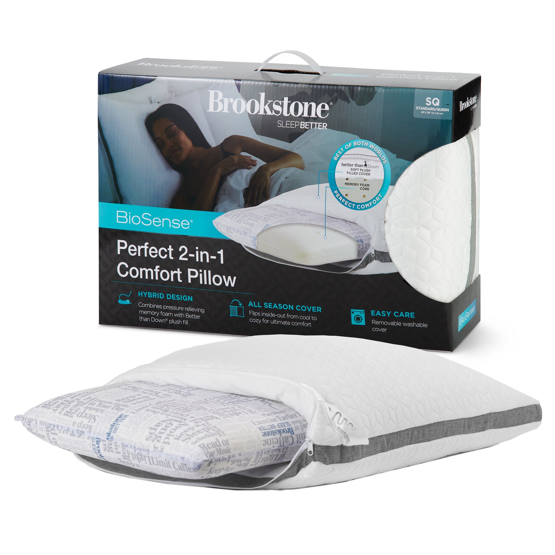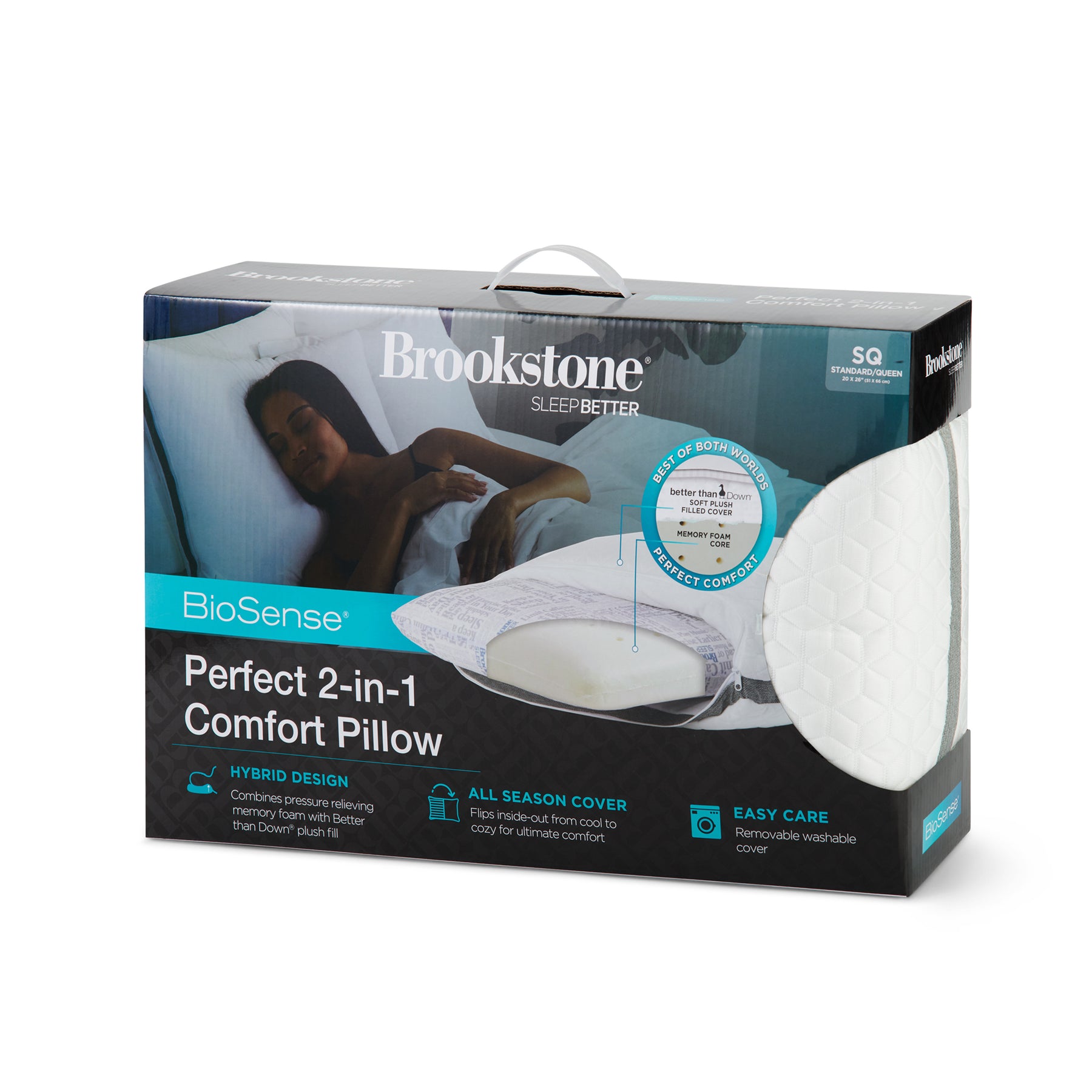 Enjoy the best of both worlds with the Brookstone Perfect 2-in-1 Comfort Pillow. Our innovative, hybrid design combines a relieving memory foam insert sealed in a Better than Down® fill cover for a firm yet plush feel. Our dual comfort pillow features an all-season cover that can be turned inside out to go from cool to cozy to personalize your comfort.