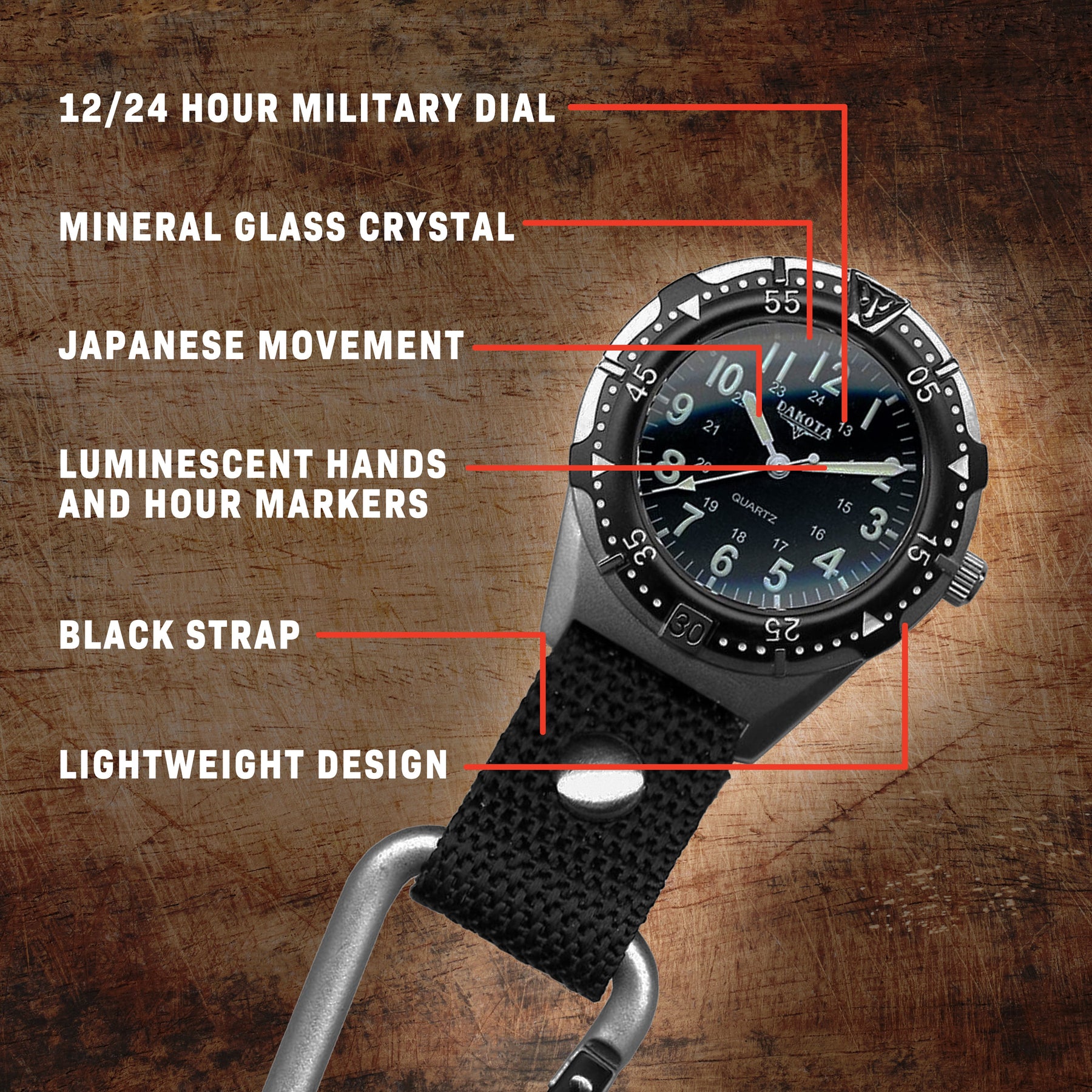 Introducing the Dakota Backpacker Clip Watch - a perfect blend of form and functionality. Designed to cater to the needs of the modern man, this watch is a suitable accessory for outdoor enthusiasts, military personnel, or anyone who values precision and convenience. This watch is not just about telling time; it's an embodiment of minimalist style, durability, and advanced features. The watch boasts an analog display, an essential feature for keeping track of your day-to-day schedules.