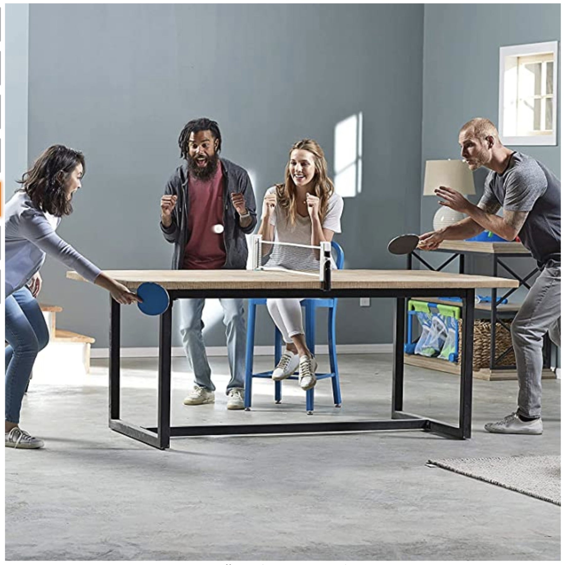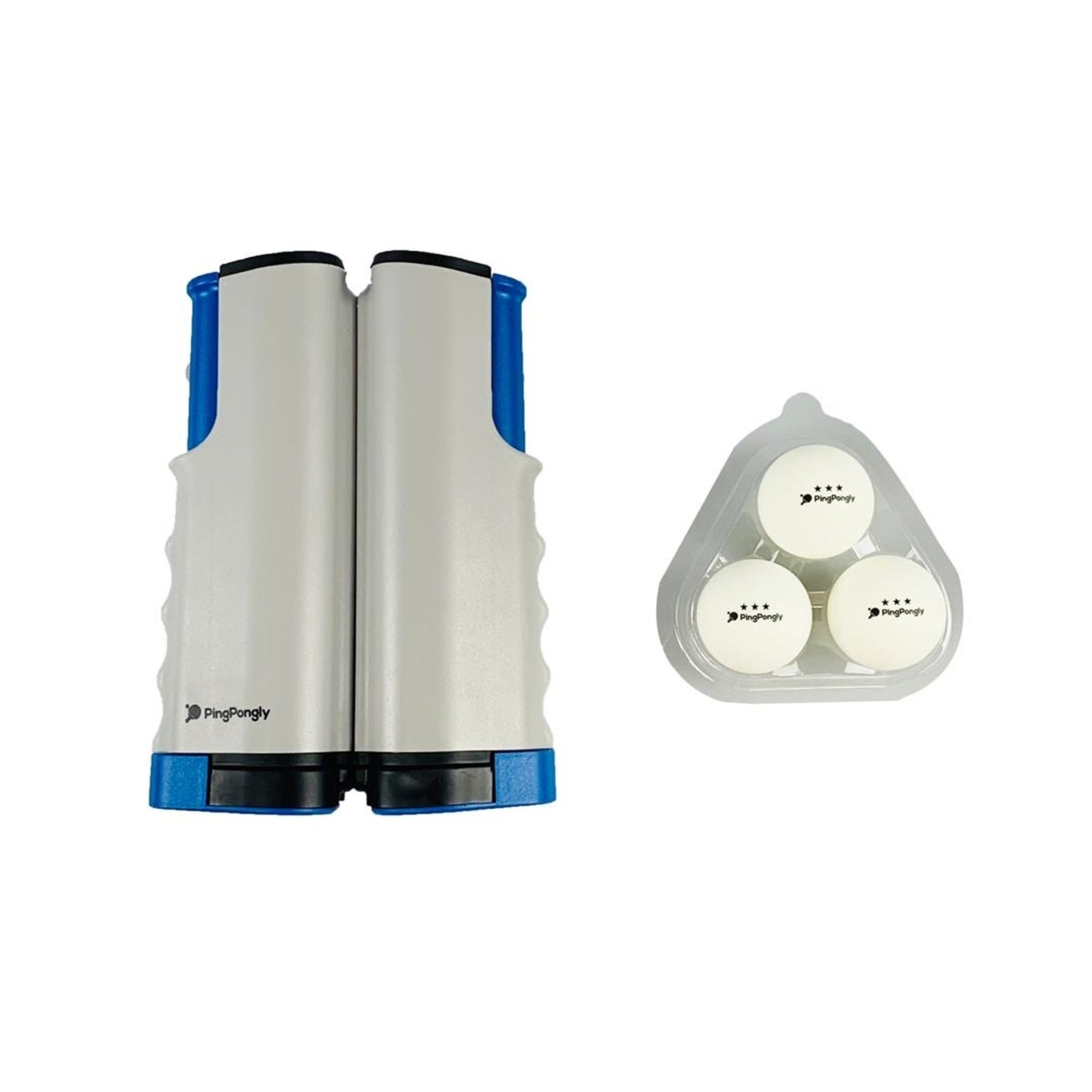 Play ping pong anytime, anywhere with the PingPongly™ Retractable Table Tennis Net! PingPongly is a portable table tennis net that transforms any table into a ping pong table. Take the retractable ping pong net, paddles, and balls and play on any table, anywhere- indoors and outdoors! Simply clip it on, and enjoy hours of fun from the comfort of your home!-PingPongly can be easily attached to any table up to 2" thick and 6' wide.-Simply clip it on and play. -PingPongly was designed with portability in mind. Set up your table anywhere, from the local park to your dining room. -Rubber grips to ensure maximum resistance against any table surface, producing a super sturdy net for ultimate gameplay. -Each PingPongly set includes: 1 retractable net 2 premium paddles, and 3 balls-Paddles (made with ITTF approved rubber that sits on top of a 1.8mm thick sponge) Anyone with a table (2" thick or less) can now play ping pong without the expense of purchasing a full table!