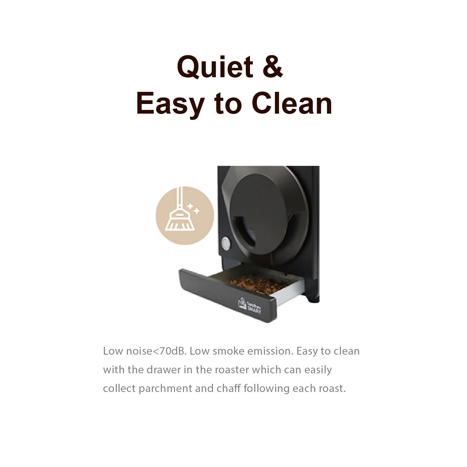 Low noise <70dB. Low smoke emission. Easy to clean with the drawer in the roaster which can easily collect parchment and chaff following each roast.