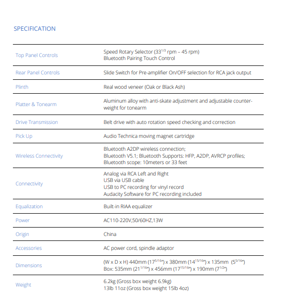 • 33 1/3 and 45 RPM speeds with auto-stop function