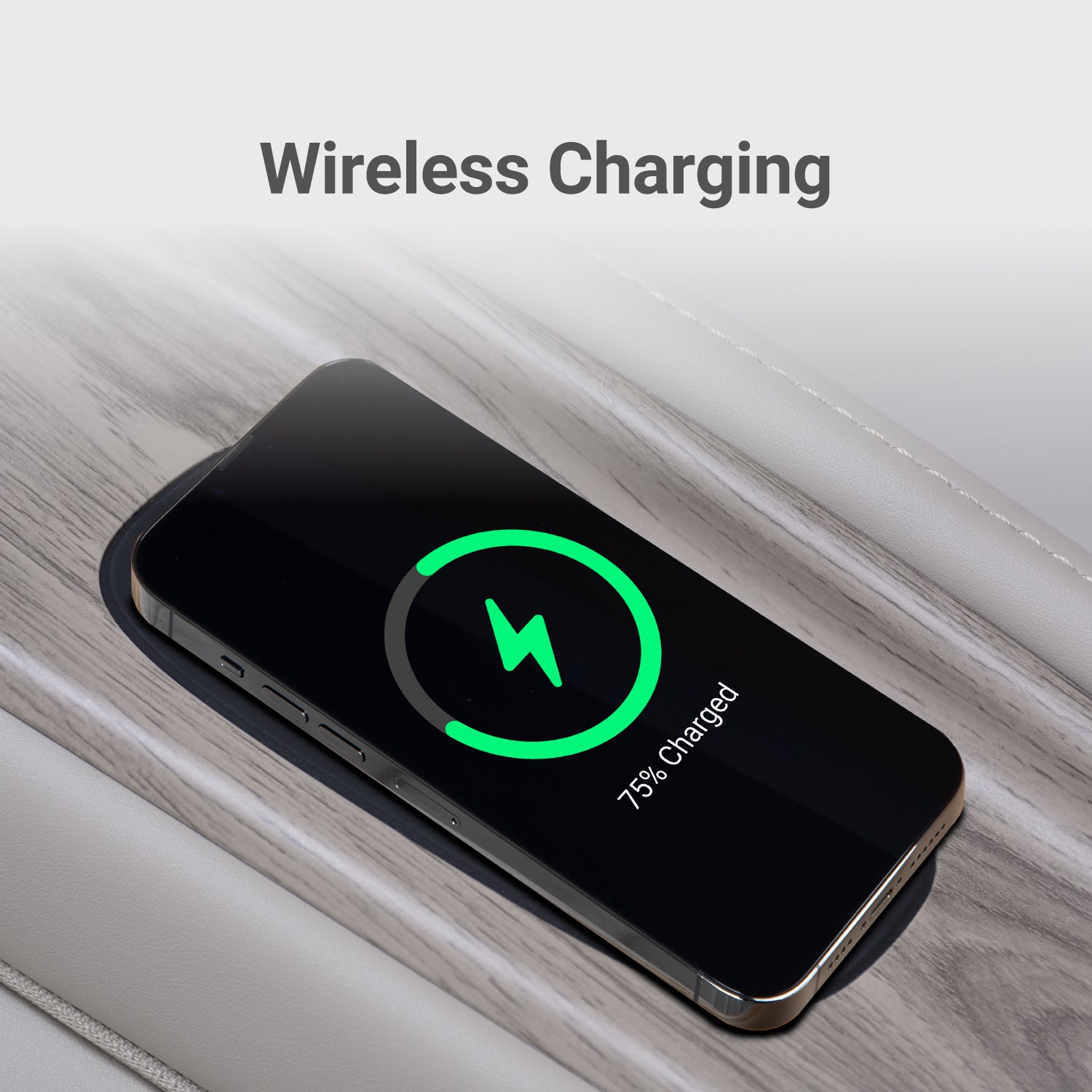 The Manhattan Duo features a wireless charger and USB port, allowing users to recharge devices while enjoying a relaxing massage.