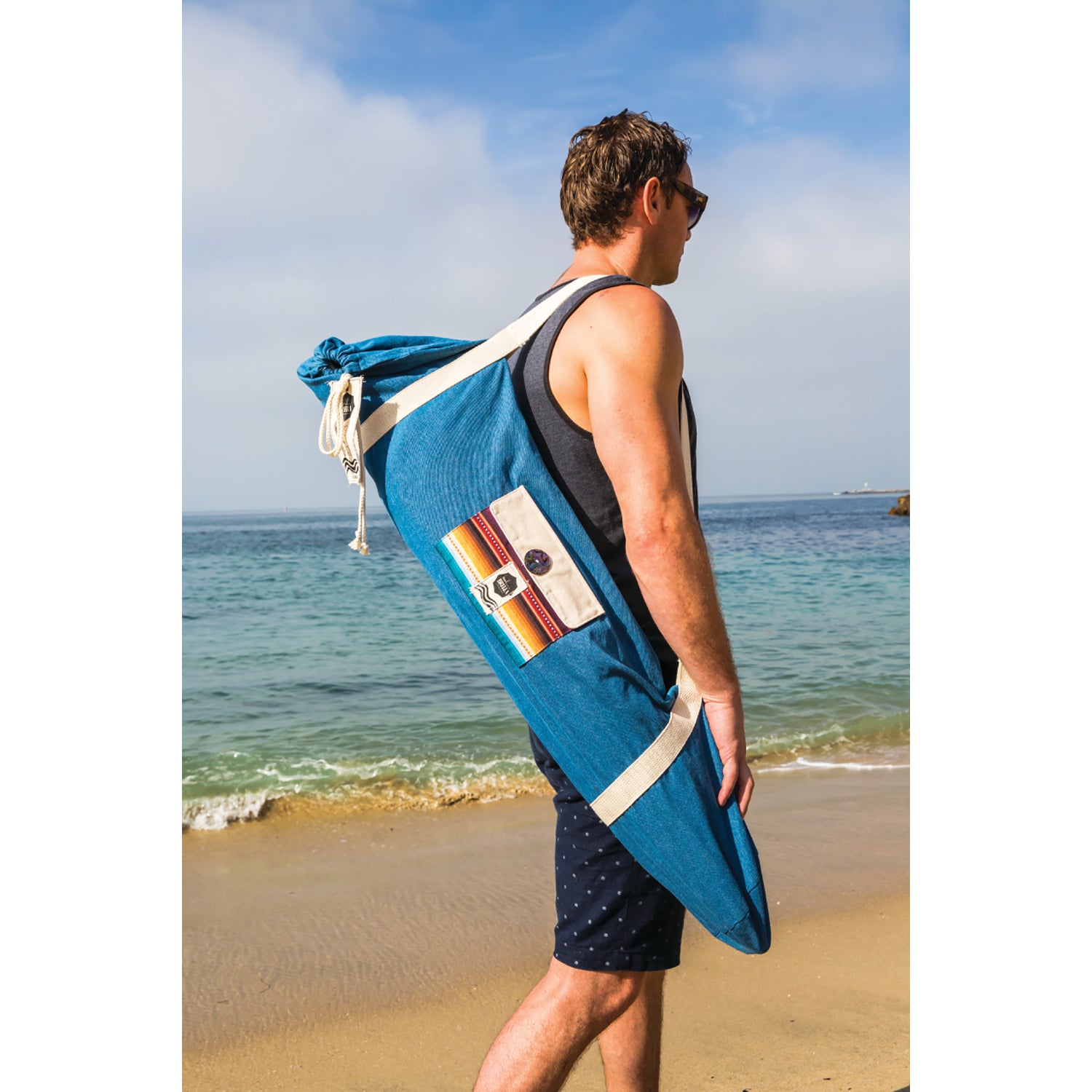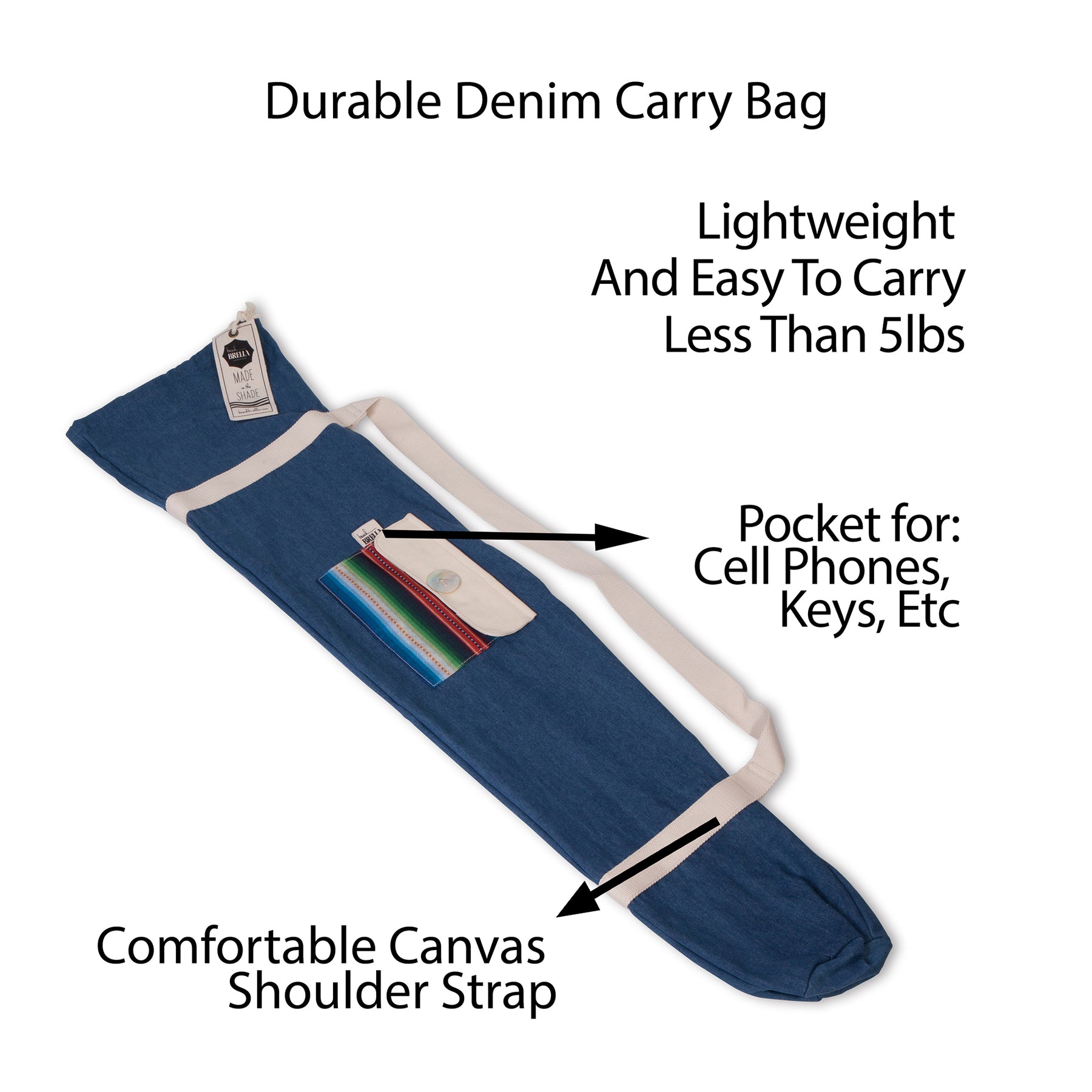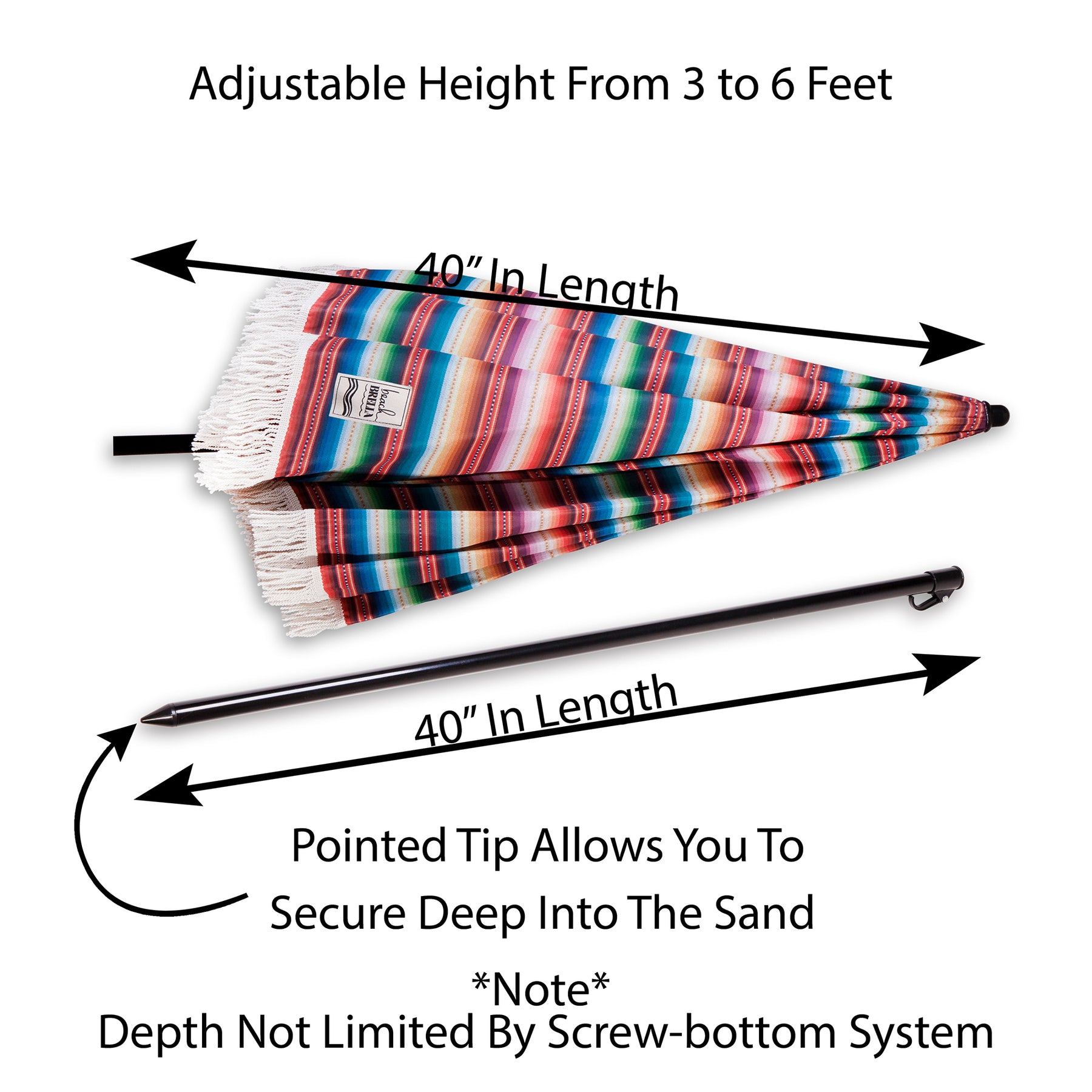 The Las Brisas beach umbrella is a colorful and festive beach umbrella that features a bohemian serape inspired pattern trimmed with chic, bouncy fringe. This one of a kind luxury beach umbrella is 100% UV sun protective. Height adjustable, 60" diameter, sand anchor and stylish denim carry bag.