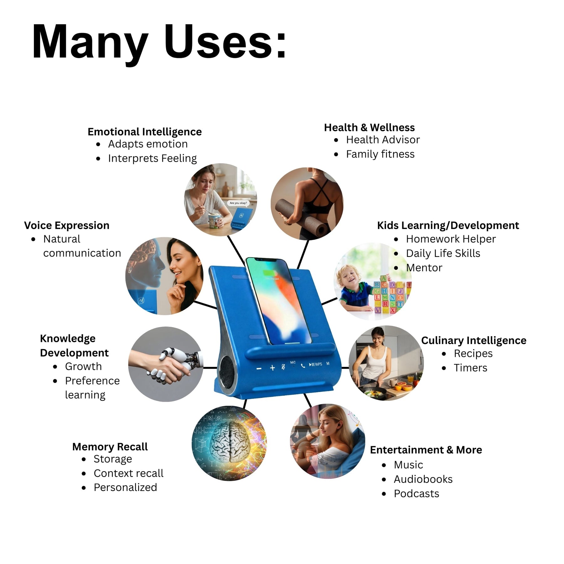 AI Home Companion is a 5-in-1 intelligent hub is designed to simplify daily life by unifying connection, conversation, and convenience into a single, elegant device. Functioning as an AI companion, docking station, wireless charger, Bluetooth speaker, and hands-free calling system, it becomes the central touchpoint of your home. Beyond hardware, its adaptive intelligence sets it apart—recalling important details, recognizing emotional cues, expressing itself naturally through voice, and continuously expanding its knowledge to better support you over time. Always present, always learning, AI Home Companion transforms technology from a passive tool into an active, responsive presence that evolves with your lifestyle.