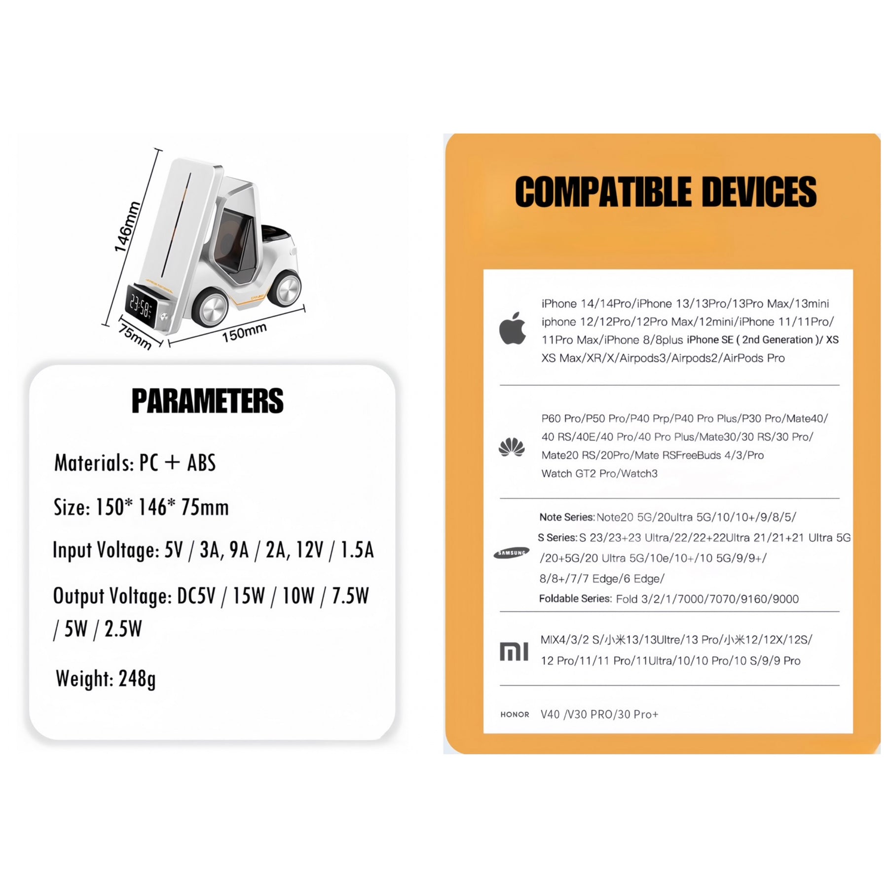 Tired of a messy desk or nightstand with devices scattered, and cables tangled? Just load, charge and organize your mobile devices and wearables in this cute Forklift Fast Wireless Charging Station!