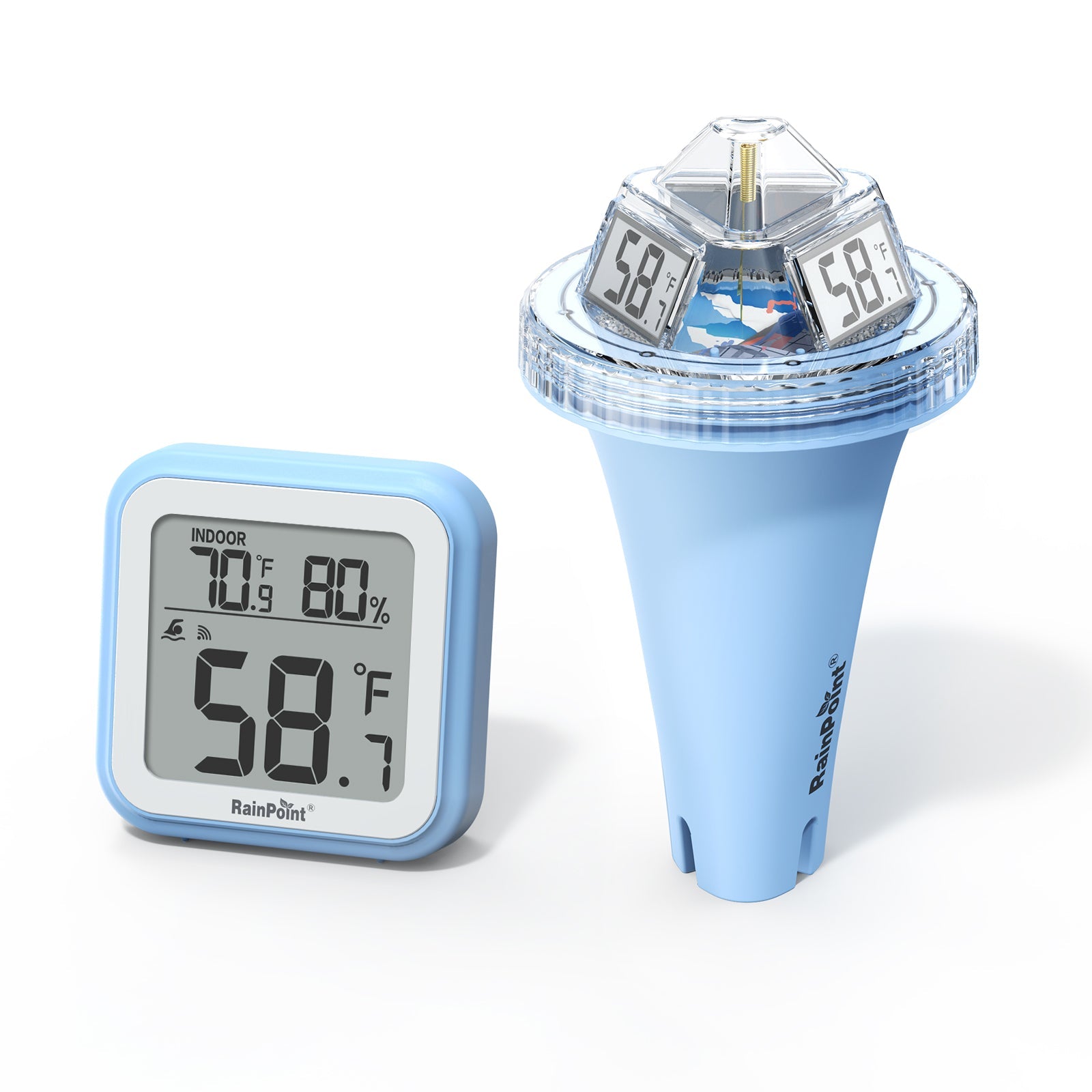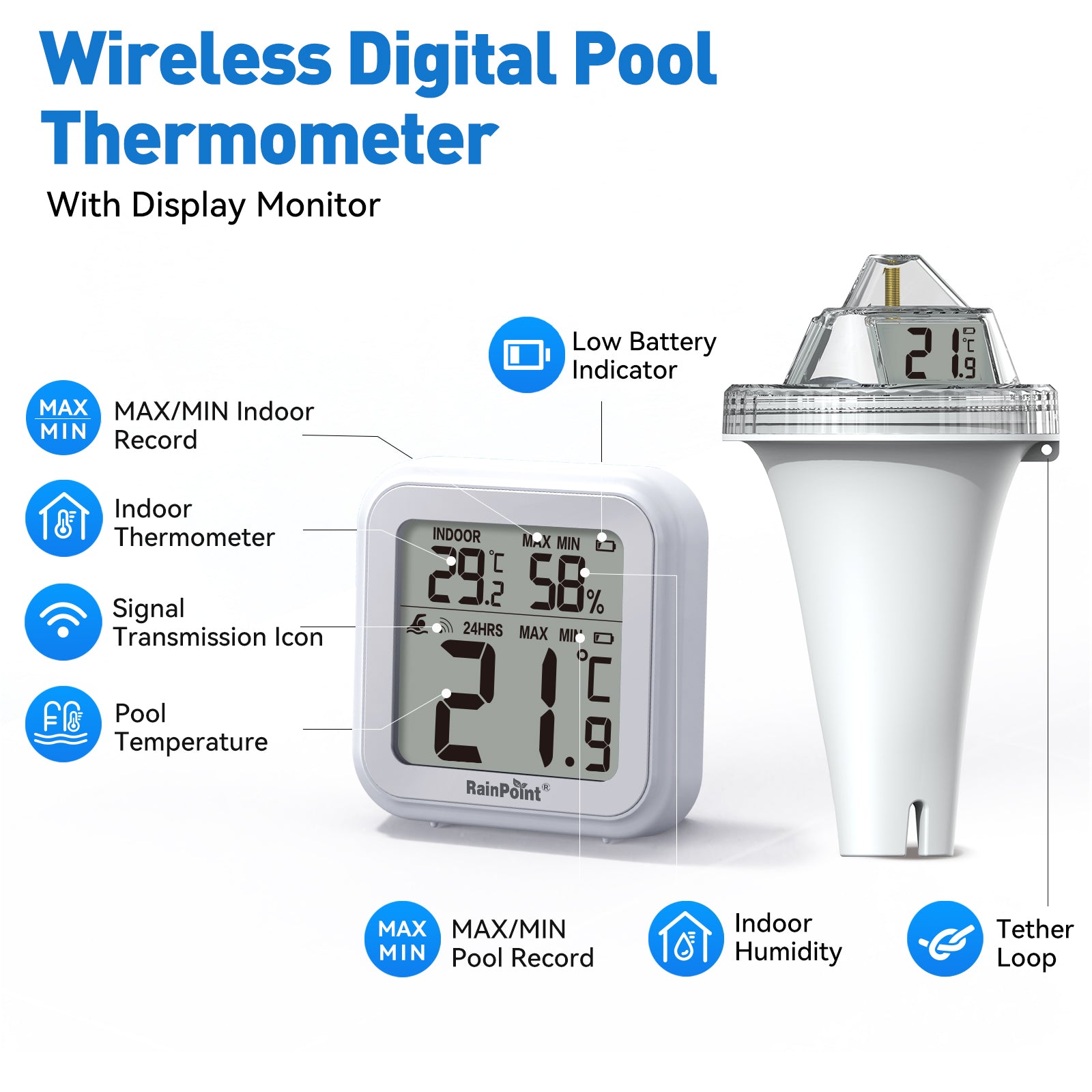 The RAINPOINT Wireless Pool Thermometer provides accurate temperature readings for swimming pools and ponds. Its indoor display allows you to check water conditions at a glance, while the wireless sensor ensures hassle-free monitoring without wires. Perfect for pool owners, pond enthusiasts, and smart home setups.