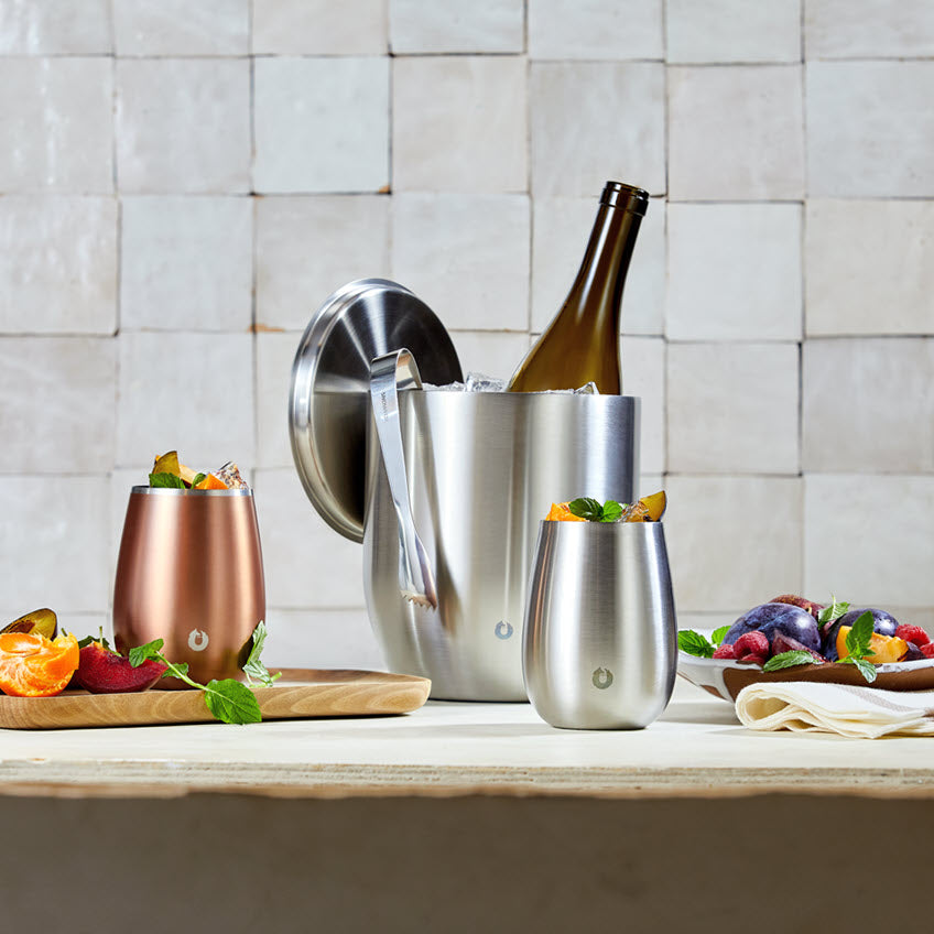 • Insulated stainless steel keeps hands from warming your wine and ice from melting and is sweat free