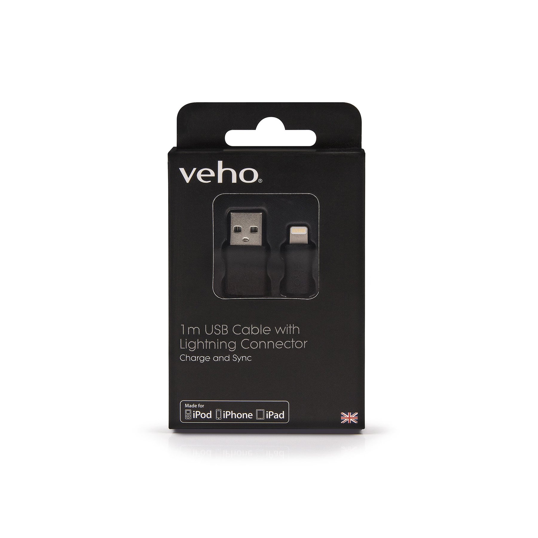 The Veho Pebble Apple approved lightning cable is compatible with all Apple lightning configured devices. It is 1m (100cm, 3.3ft) and comes in black soft touch Tacton rubber with embossed Veho logos.