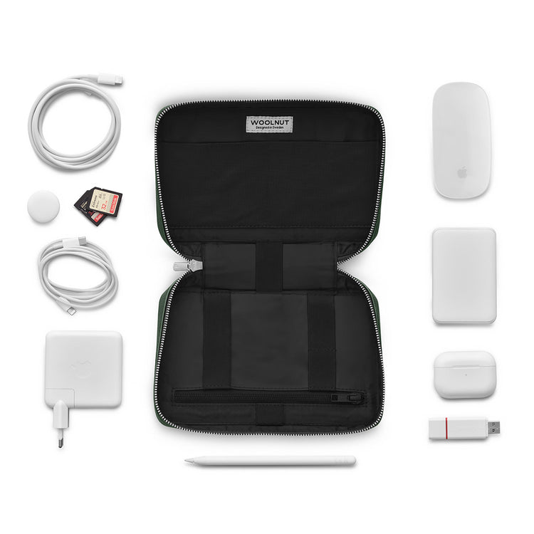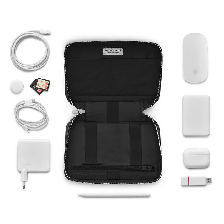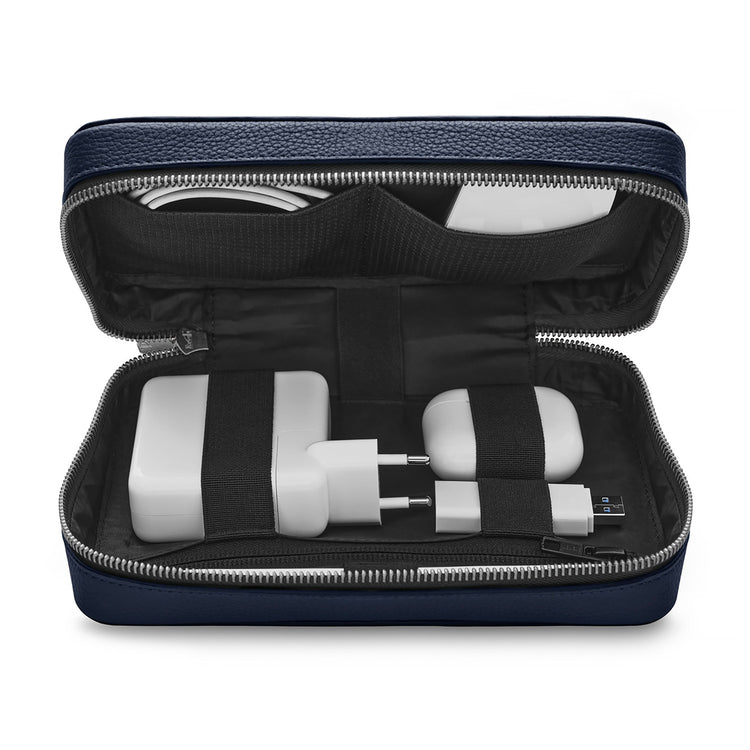 Keep your everyday tech accessories neatly organized in one place with this minimalistic and highly functional leather Tech Organizer. Designed for smart storage of all your essentials, from chargers to memory cards, this travel pouch for tech accessories can be opened flat for super easy access. The clever pockets and elastic straps are thoughtfully designed to effortlessly bring your tech accessories along for everyday use as well as longer travels. This Tech Organizer is built with great capacity and smart functions in mind, all packed in a slim design. The stretch mesh pockets are perfect for things like a laptop charger, mouse, SSD, powerbank or longer cables. The sturdy elastic straps can hold chargers, cables, AirPods, memory cards, adapters or pens. There is also a zipped inside pocket for smaller essentials, with a built-in compartment made especially for an AirTag or some SD-cards.